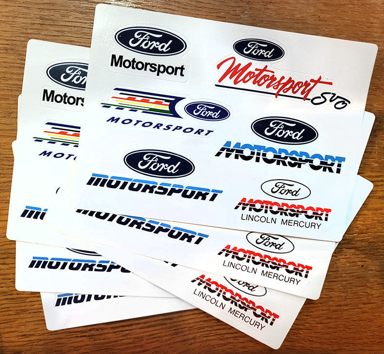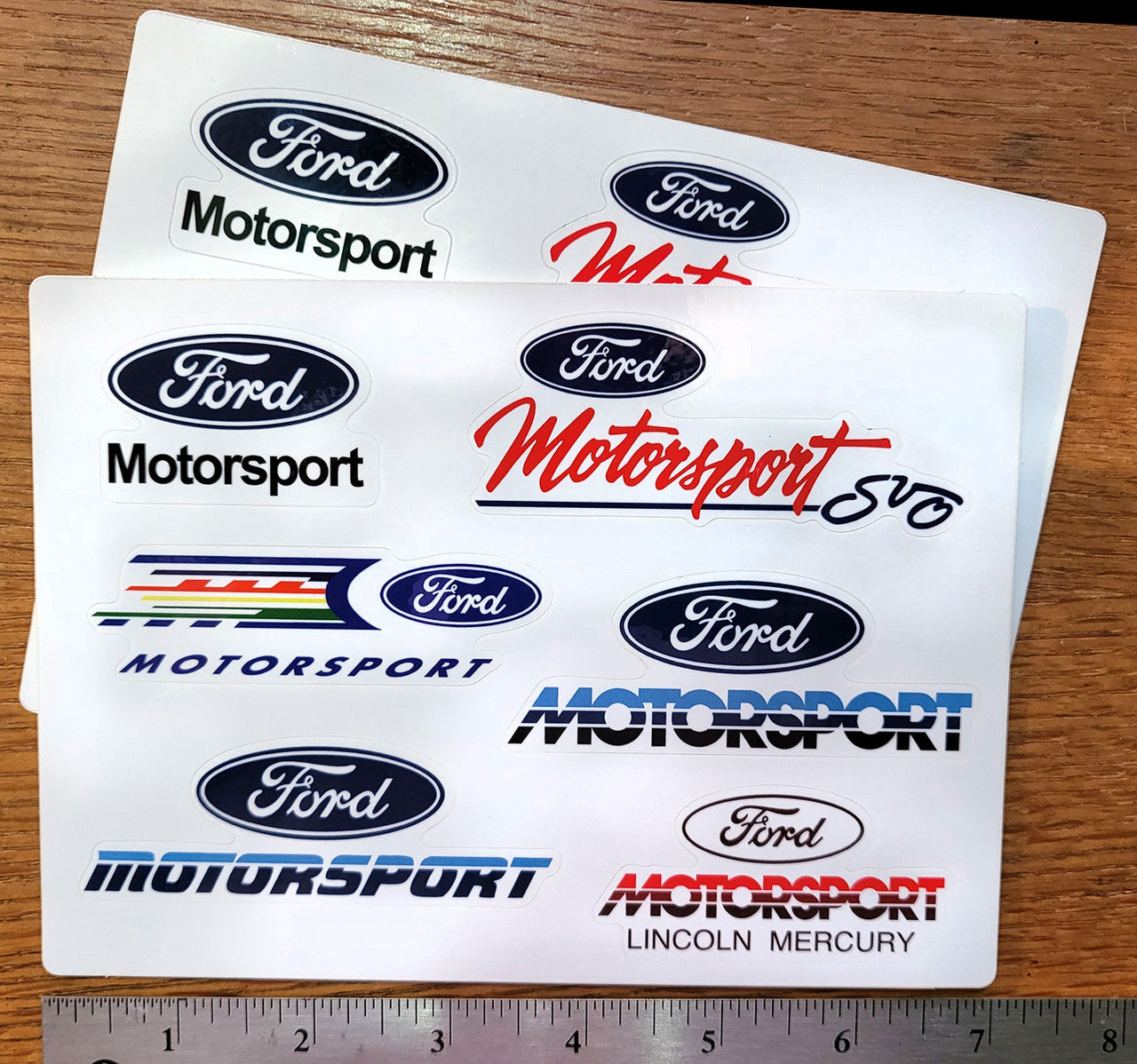 Sheet size is 7 x 5" with 6 different Ford Motorsport logo stickers. Each sticker is die cut around the logo.
