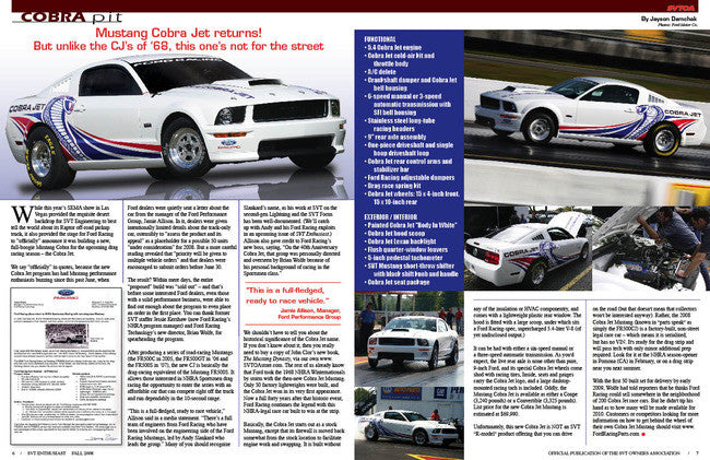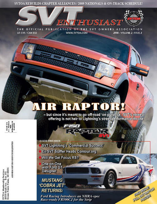 Fall 2008 issue of the SVTOA's official member magazine! This issue features exclusive coverage of SVT's new Raptor off-road truck and Ford Racing's awesome CobraJet drag car as well as feature articles for all other SVT fans!